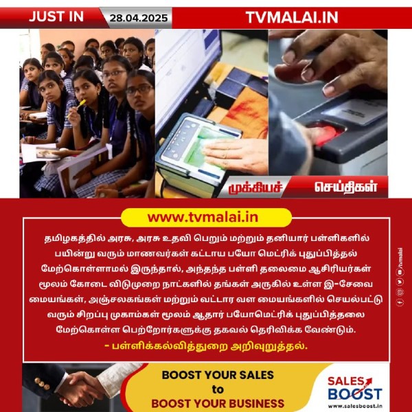 தமிழகத்தில் அரசு, அரசு உதவி பெறும் மற்றும் தனியார் பள்ளிகளில் பயின்று வரும் மாணவர்கள் கட்டாய பயோ மெட்ரிக் புதுப்பித்தல் மேற்கொள்ளாமல் இருந்தால், அந்தந்த பள்ளி தலைமை ஆசிரியர்கள் மூலம் கோடை விடுமுறை நாட்களில் தங்கள் அருகில் உள்ள இ-சேவை மையங்கள், அஞ்சலகங்கள் மற்றும் வட்டார வள மையங்களில் செயல்பட்டு வரும் சிறப்பு முகாம்கள் மூலம் ஆதார் பயோமெட்ரிக் புதுப்பித்தலை மேற்கொள்ள பெற்றோர்களுக்கு தகவல் தெரிவிக்க வேண்டும். – பள்ளிக்கல்வித்துறை அறிவுறுத்தல்.