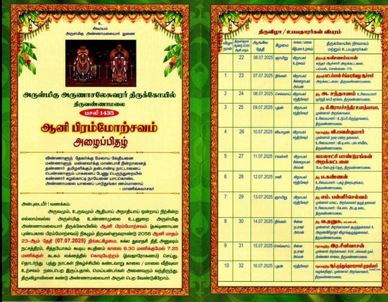 அருள்மிகு அண்ணாமலையார் திருக்கோயிலில், ஆனி மாதம் 23 (07.07.2025) திங்கட்கிழமை காலை 6.30 – 7.25 மணிக்குள் பிரம்மோற்சவ தொடக்கமாக கொடியேற்றம் நடைபெறுகிறது. இதனைத் தொடர்ந்து பத்து நாட்கள் காலை மற்றும் மாலை வீதிவுலா உற்சவம் நடைபெறும்.