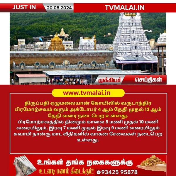 திருப்பதி ஏழுமலையான் கோயிலில் வருடாந்திர பிரமோற்சவம் வரும் அக்டோபர் 4 ஆம் தேதி முதல் 12 ஆம் தேதி வரை நடைபெற உள்ளது. பிரமோற்சவத்தில் தினமும் காலை 8 மணி முதல் 10 மணி வரையிலும், இரவு 7 மணி முதல் இரவு 9 மணி வரையிலும் சுவாமி நான்கு மாட வீதிகளில் வாகன சேவைகள் நடைபெற உள்ளது