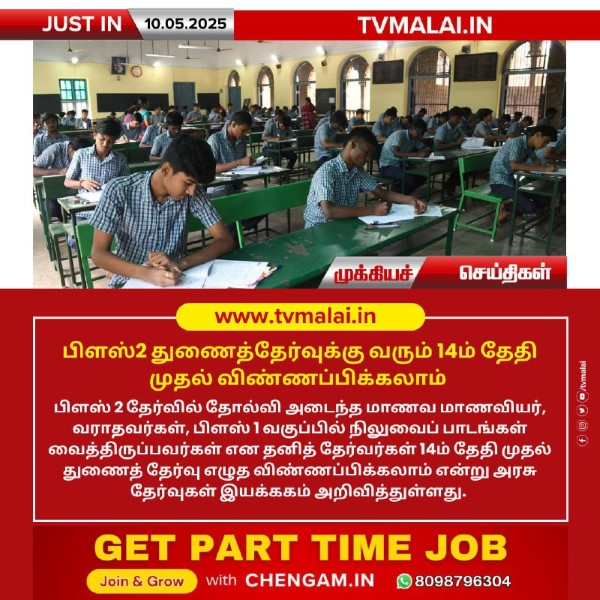 பிளஸ் 2 தேர்வில் தோல்வி அடைந்த மாணவ மாணவியர், வராதவர்கள், பிளஸ் 1 வகுப்பில் நிலுவைப் பாடங்கள் வைத்திருப்பவர்கள் என தனித் தேர்வர்கள் 14ம் தேதி முதல் துணைத் தேர்வு எழுத விண்ணப்பிக்கலாம் என்று அரசு தேர்வுகள் இயக்ககம் அறிவித்துள்ளது.