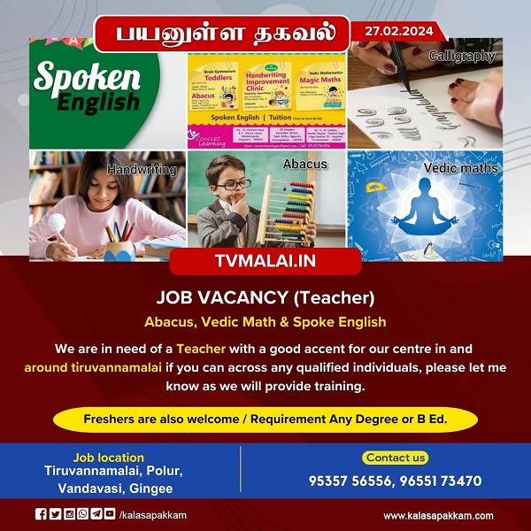 We are in need of an English Teacher with a good accent for our center in Tiruvannamalai & Polur. If you come across any qualified individuals, please let me know as we will provide training.
