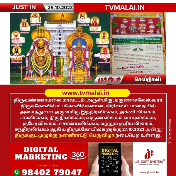 திருவண்ணாமலை மாவட்டம், அருள்மிகு அருணாசலேஸ்வரர் திருக்கோவில் உபகோவில்களான, கிரிவலப் பாதையில் அமைந்துள்ள அருள்மிகு இந்திரலிங்கம், அக்னி லிங்கம், எமலிங்கம், நிருதிலிங்கம், வருணலிங்கம் வாயுலிங்கம், குபேரலிங்கம், ஈசான்யலிங்கம், மற்றும் சூரியலிங்கம், சந்திரலிங்கம் ஆகிய திருக்கோயில்களுக்கு 27.10.2023 அன்று திருக்குட முழுக்கு நன்னீராட்டு பெருவிழா நடைபெற உள்ளது.