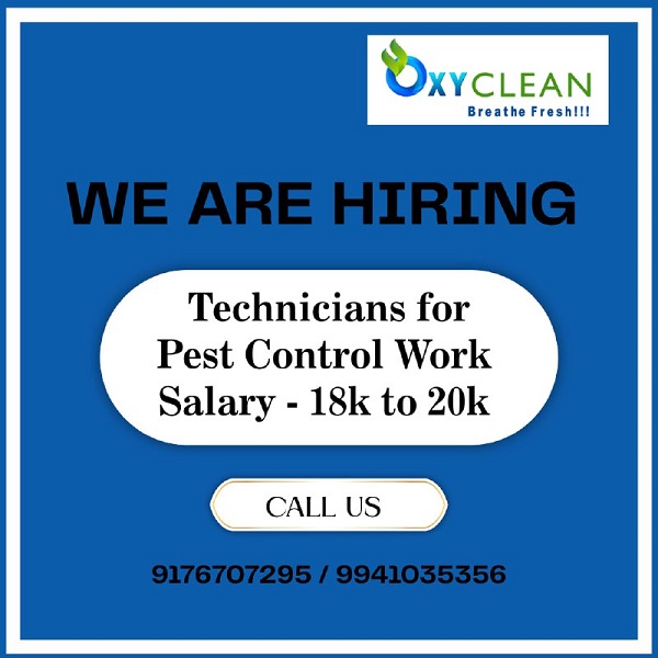OxyClean, a leading name in hygiene and sanitation services, is currently hiring technicians for pest control work in Korattur, Chennai. The company is offering a competitive salary ranging from ₹18,000 to ₹20,000, along with free accommodation for selected candidates.