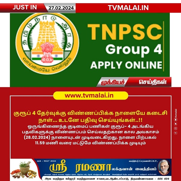 ஒருங்கிணைந்த குடிமைப் பணிகள் குரூப்-4 அடங்கிய பதவிகளுக்கு விண்ணப்பம் செய்வதற்கான கால அவகாசம் (28.02.2024) நாளையுடன் முடிவடைகிறது. நாளை பிற்பகல் 11.59 மணி வரை மட்டுமே விண்ணப்பிக்க முடியும்.